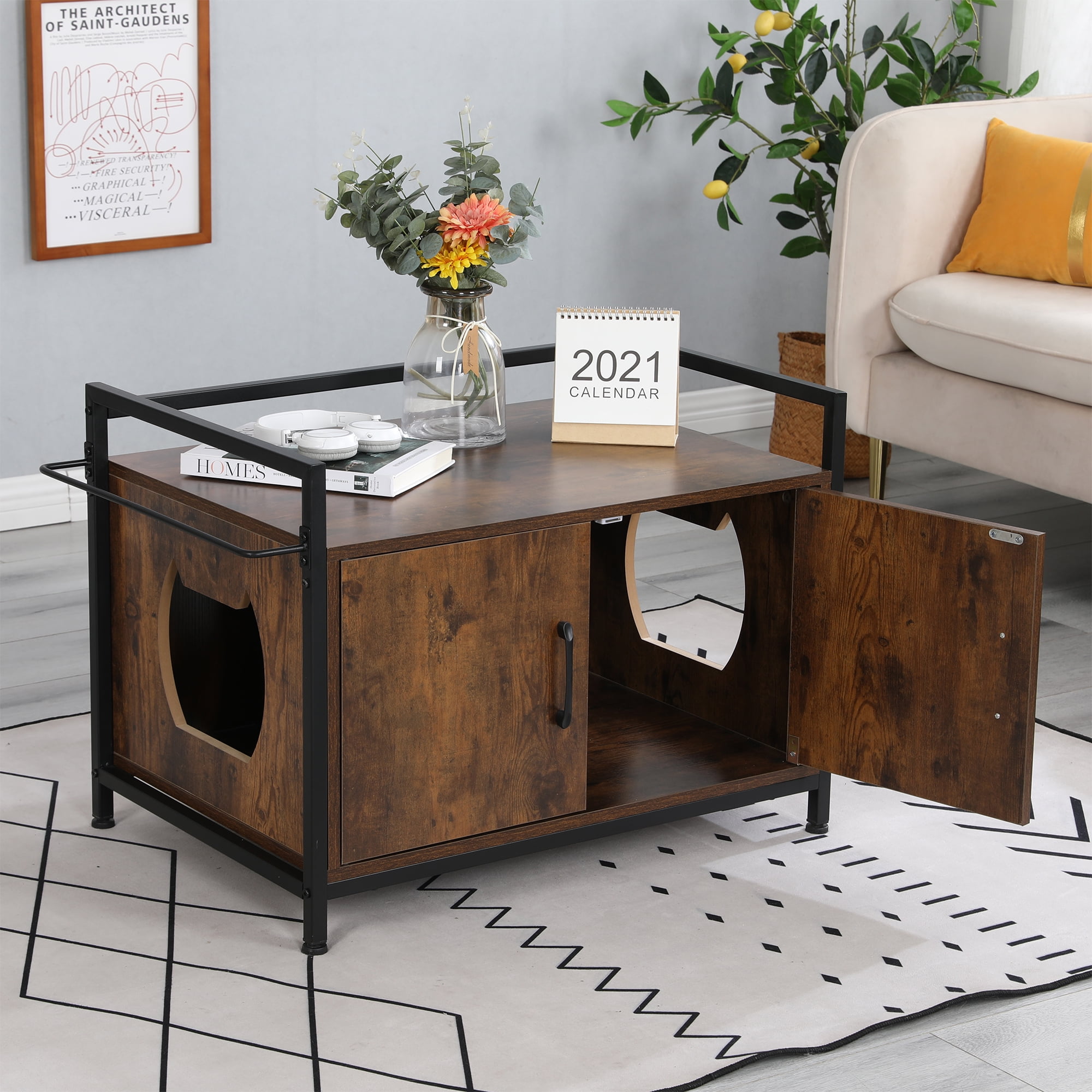 30 Inches Litter Box Hidden Furniture Pet Crate With Iron And Wood Sturdy Structure Cat Dog House Nightstand Walmart Com